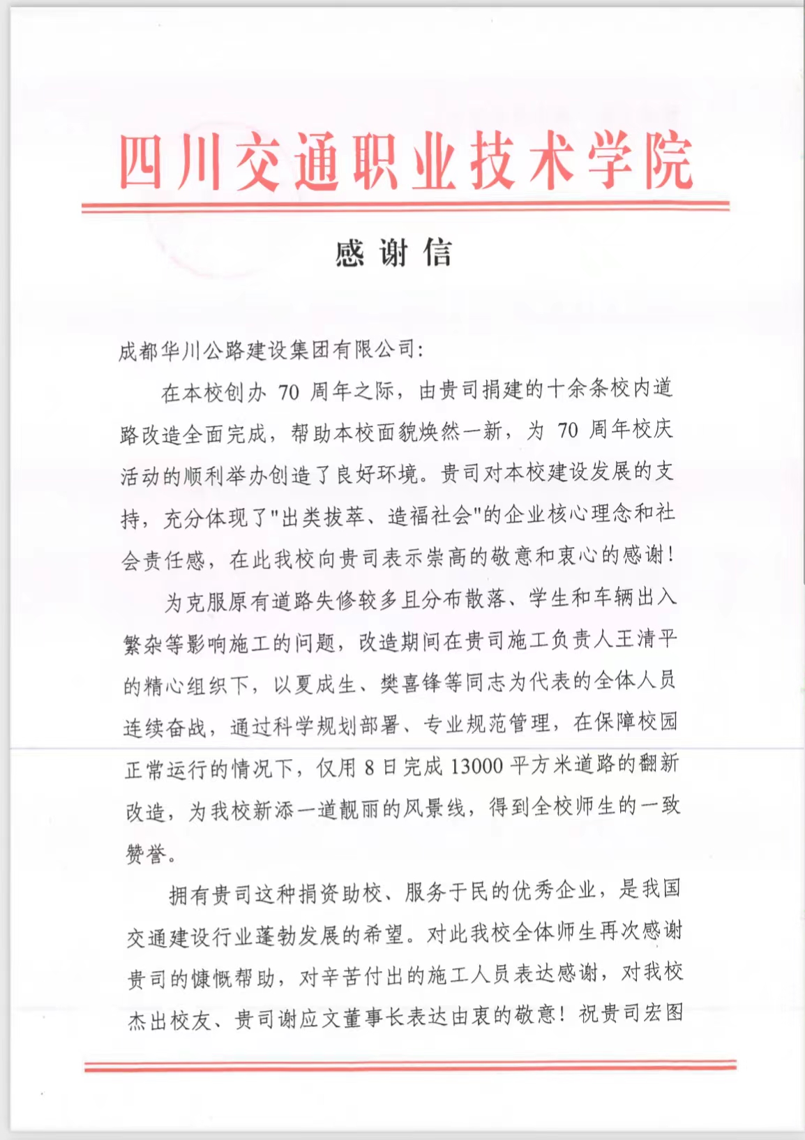 近日,四川交通職業(yè)技術(shù)學(xué)院發(fā)來感謝信,對華川集團在交職院建校70周年之際捐建校園道路改造項目表示衷心的感謝。
