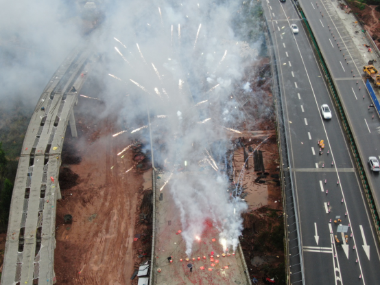 11月24日10時18分,隨著新店樞紐互通G匝道橋最后一片小箱梁被吊裝設(shè)備穩(wěn)穩(wěn)安放在最后一跨墩柱上,現(xiàn)場慶祝的煙花頓時直沖云霄,鞭炮聲、歡呼聲、吶喊聲響成一片。對于參與新店樞紐互通施工的每一個參建者來說,這是一個激動人心的時刻。新店樞紐互通最后一片箱梁順利架設(shè)成功,標(biāo)志著整個新店樞紐互通主體結(jié)構(gòu)施工全面完工,提前6天完成了營達(dá)公司下達(dá)的目標(biāo)任務(wù)。