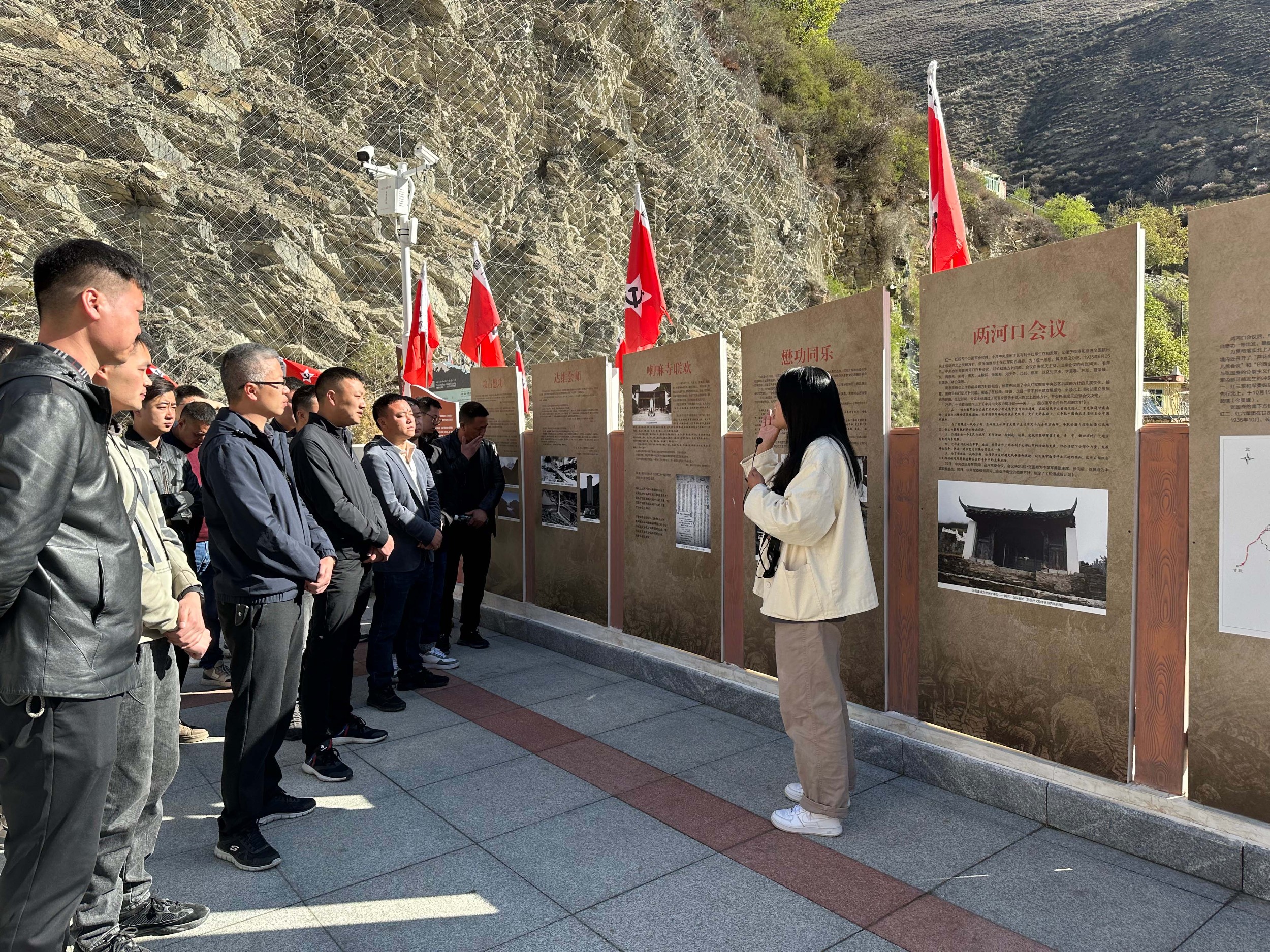 紀(jì)念碑基座背面刻有碑志,其余三面刻有翻越夾金山、達(dá)維會師、紅軍不怕遠(yuǎn)征難三座浮雕,這些浮雕讓青年員工們更加深刻地回顧了當(dāng)年會師的困難與艱辛。